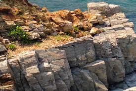 The exposed bedrock at Portland Head belongs to the Cushing Formation, which is named for Cushing Island. The Cushing Formation underlies an area that stretches northeasterly across Casco Bay from the Delano Park area through Cushing Island, Peaks Island, Long Island, Chebeague Island, the Goose Islands and Birch Island to the Brunswick shore. The Cushing Formation is more resistant to weathering which is why it forms such prominent rocky headlands and islands. A close look at the rocks at Portland Head reveal clues to the long geologic history. The Cushing Formation was produced through volcanic activity approximately 470 million years ago. During this time the rocks were heated, liquefied, compressed, and twisted, causing the rocks to be stretched and deformed. This deformation produced the lineation of the minerals that characterizes the Cushing formation. The rock is broken along a series of straight, parallel fractures that are oriented east-west and vertical.