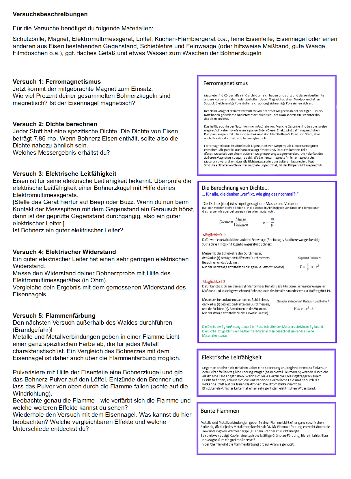 Mit dem Versuchsleitfaden sollst du durch Experimente etwas mehr über das erdgeschichtliche Zeugnis Bohnerz, sein Vorkommen, sowie die physikalischen und chemischen Eigenschaften in Erfahrung bringen.
