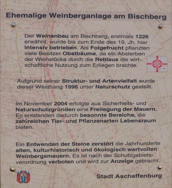 - Die Mauern und darüberliegenden Terrassen sollen nicht betreten werden, um den Schutzzweck des geschützten Landschaftsbestandteils „Bischberg-Westhang“ aufrecht zu erhalten.