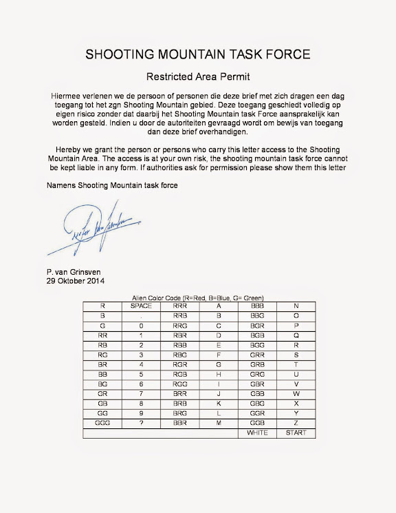 -GCanoniem heeft ook een geheel eigen Alien Morse Code systeem ontdekt dan wel ontwikkeld. Het bestaat uit de kleuren Blauw (B), Groen (G) en Rood(R). Open deze link http://tinyurl.com/GAPermit , druk het af en vergeet dit niet mee te nemen!!