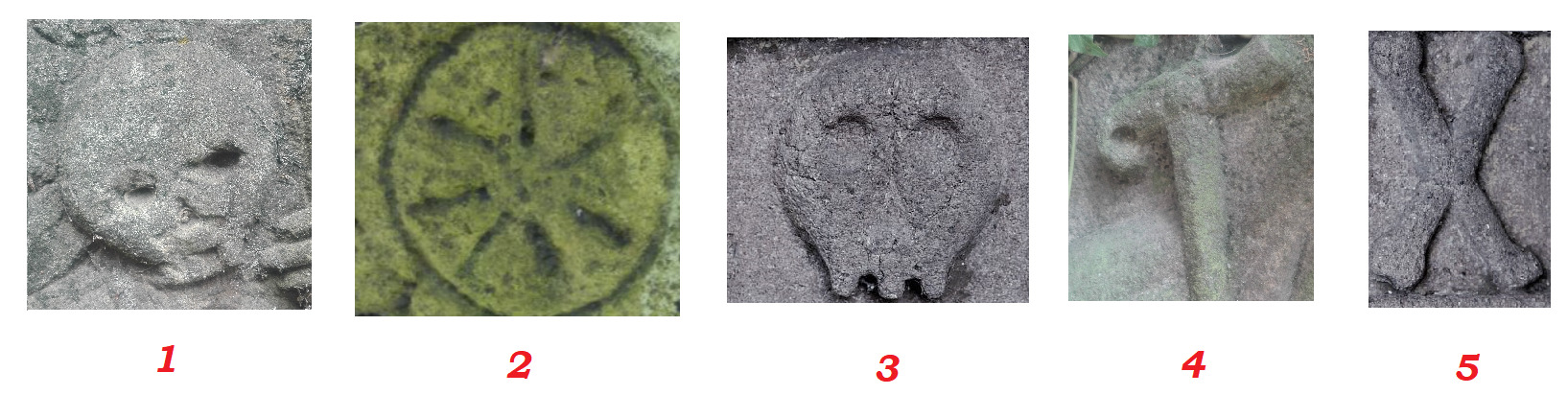 Zde máte vyfocených 5 různých ornamentů, kdy právě DVA z nich naleznete, ostatní tři se na kříži nenachází.