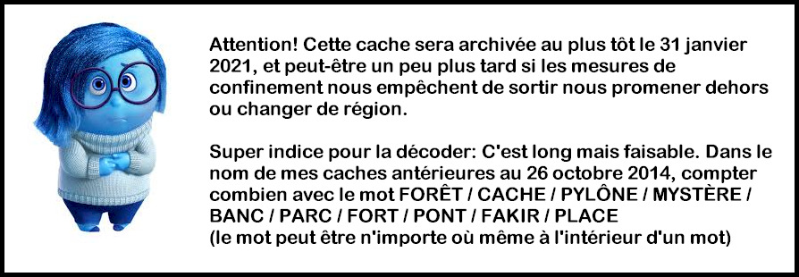 mlafortu: Tel qu'annoncé en janvier, cette cache est maintenant archivée. Cette cache aura vécu 6 ans et 3 mois et aura reçu 69 founds. Merci de votre visite et de vos logs.