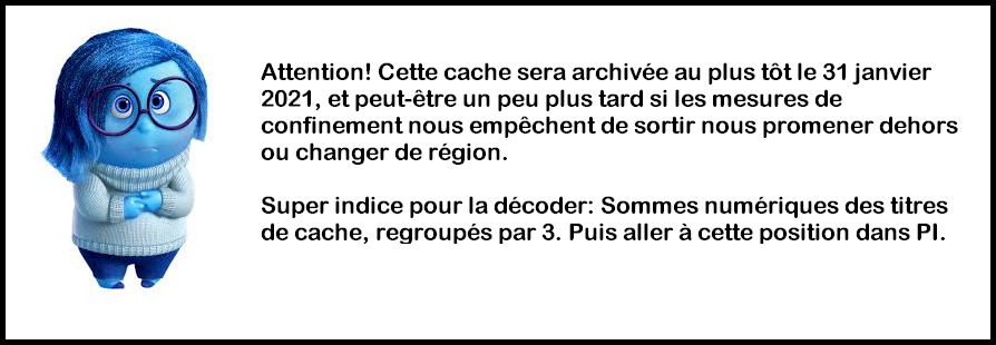 mlafortu: Tel qu'annoncé en janvier, cette cache est maintenant archivée. Cette cache aura vécu 8 ans et 5 mois et aura reçu 65 founds. Merci de votre visite et de vos logs.