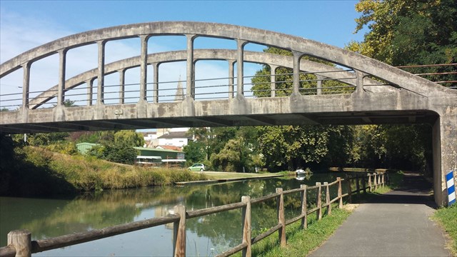 La cache vous présente: les différent ponts emblématiques du canal de Garonne: Pont à poutre en béton armés - les Ponts BOW-STRING que l'on retrouve tout au long du canal.. Les ponts bow-string enjambent la voie d'eau à 83 endroits entre Toulouse et Castets. Construits dans les années 1930, ces ponts en béton remplacèrent à l'époque des ponts suspendus. Ces derniers, édifiés à la construction du canal, présentaient des signes de fatigue.