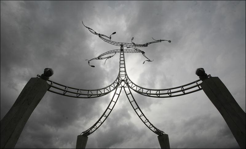 The centerpiece of the park is a kinetic metal sculpture atop four concrete columns. The artwork has arms attached to eight propellers that spin in the wind and is the creation of Chicago artist Evan Lewis, who said he wanted the area around the sculpture to be “a place of repose.” Beneath the sculpture is a plaque honoring the bridge’s builders, especially the five who died. Mr. Lewis, who was chosen from more than 70 artists expressing interest in the Toledo project, told Thursday’s attendees, “This is by far the greatest challenge I have ever tackled as an artist, a sculptor.” But he said he was inspired by the help he received from the ironworkers, electricians, and carpenters who volunteered their time and offered advice.