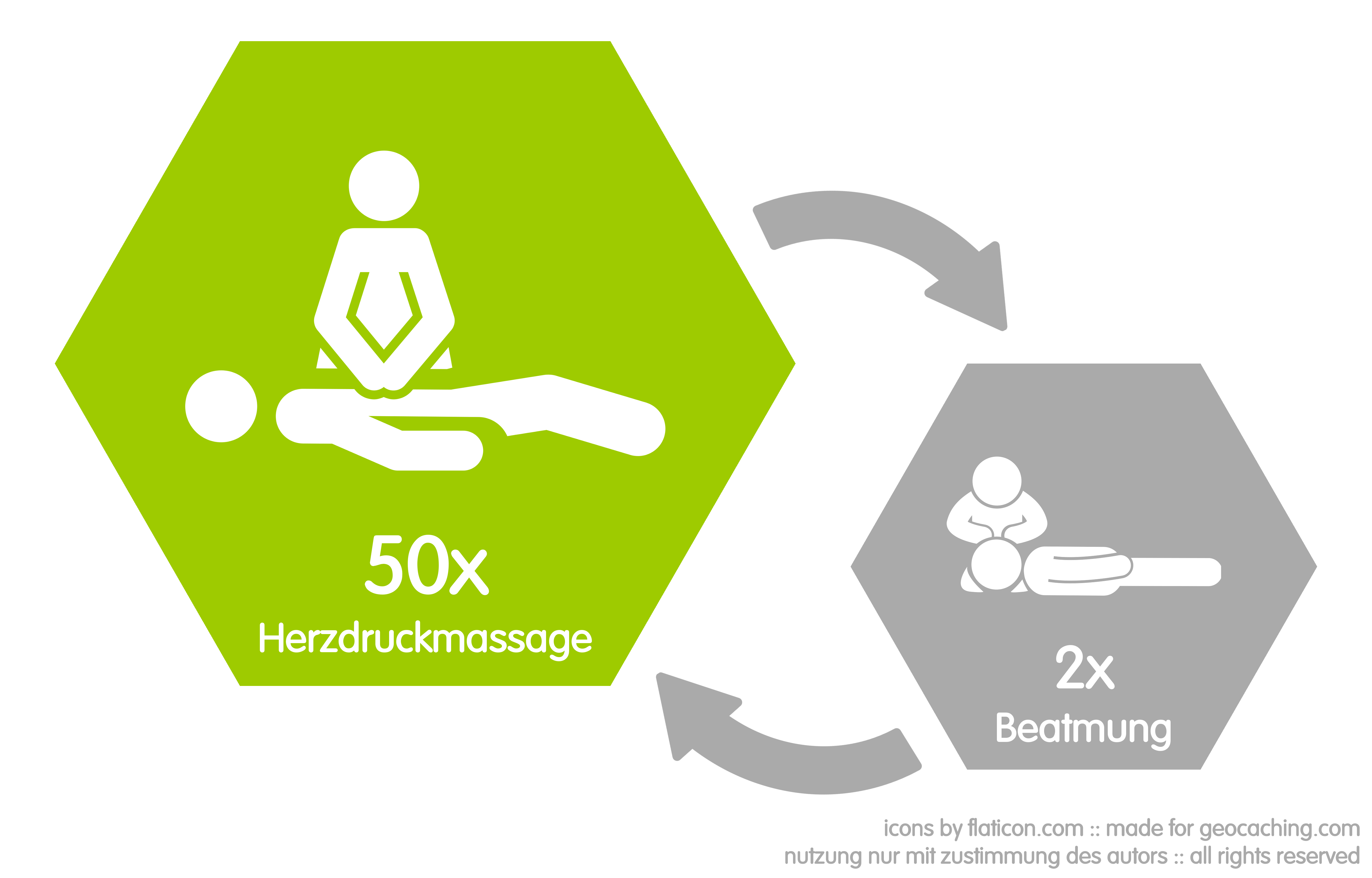 Du hast bei einem Verunglückten festgestellt, dass er nicht mehr atmet. Du beginnst direkt mit einer Herzdruckmassage. Seit einiger Zeit ist es nicht mehr zwingend vorgeschrieben, dass eine Beatmung stattzufinden hat, da der in den Blutgefäßen vorhandene Sauerstoff noch einige Zeit reicht und eine sofortige Herzdruckmassage ohne Verzögerung oder Unterbrechung somit effektiver sein kann. Der Sauerstoff muss einfach nur schnell zum Gehirn transportiert werden. Wenn du es dir zutraust, dann führe aller 50 "Herzdrücker" zwei Beatmungen durch. Wenn nicht, ist das auch in Ordnung! Führe einfach mit 100x Drücken pro Minute die Herzdruckmassage durch, bis der Rettungsdienst eintrifft oder der Betroffene wieder selbstständig zu atmen beginnt.