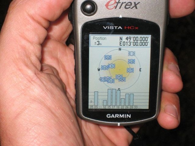 Der Schnittpunkt dieser beiden Großkreisbögen sowie eine notwendige Wegpunkt-Projektion markieren den Cache.