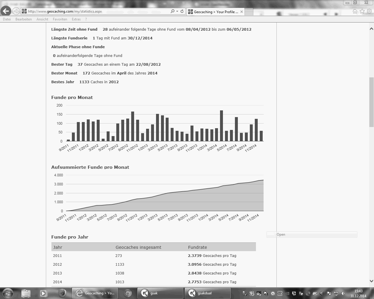 Ihr müsst in drei aufeinander folgenden Kalenderjahren, also z.B. in den Jahren 2011, 2012 und 2013) pro Jahr mindestens 1.000 Caches geloggt haben. Dies ist in geeigneter Weise (Verweis auf euer öffentliches Profil oder Screenshot von eurer Statistik) nachzuweisen. Dabei ist es gleichgültig, welche Cachearten gefunden wurden.
