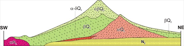 The structure of Mt. Fuji is as shown in the figure below with Komitake volcano (αQ2), Old Fuji volcano (βQ2) and New Fuji volcano (αβQ2).