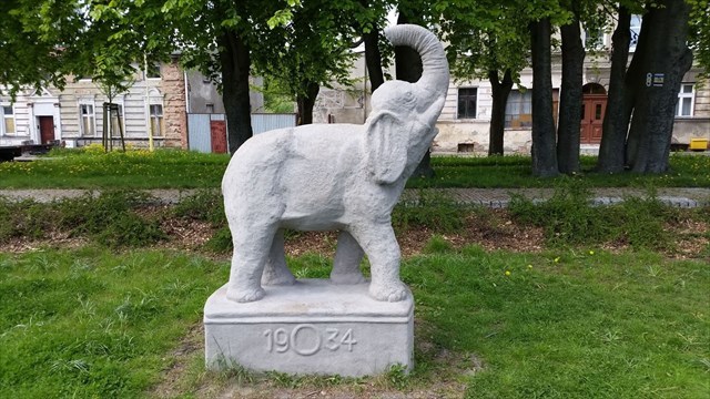 Słoń niedawno przeszedł renowację i obecnie data na pomniku jest już poprawna. / The sculpture was renewed recently and nowadays the date on the sculpture is correct. (03.05.2018)