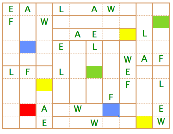 Een tatami is een traditionele Japanse mat gemaakt van rijststro en wordt afgewerkt met een kleurrijke rand. De rechthoekige mat is van oudsher circa 90 bij 180 cm. In Japan wordt de grootte van huizen en kamers nog steeds uitgedrukt in een aantal tamami. Tatami matten worden volgens strikte regels in een bepaald verband gelegd. Belangrijk daarbij is dat de hoeken van drie of meer tatami’s elkaar niet mogen raken. Dat zou volgens de Japaners ongeluk kunnen brengen. Deze puzzel kan gemaakt worden door alle tatami’s te vullen met de de letters van het woord WAFEL. Elke letter mag slechts een keer in een tatami geplaatst worden. In elke rij en kolom komen alle letters even vaak voor. Twee gelijke letter mogen elkaar horizontaal of verticaal niet raken. Veel succes!