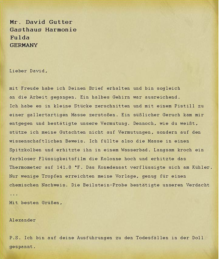 Ein Zufall wollte es, daß ich ein Konglomerat aus Briefen des Herrn Gutter auf einem Flohmarkt erstanden habe. Es handelt sich um Korrespondenzen mit Alexander O. Gettler, einem Toxikologen aus New York zur Zeit der Prohibition. Hier der erste Brief der mir erst ein Rätsel aufgab, dann war aber doch klar um was es sich handelt.