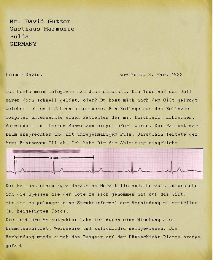 Ein Zufall wollte es, daß ich ein Konglomerat aus Briefen des Herrn Gutter auf einem Flohmarkt erstanden habe. Es handelt sich um Korrespondenzen mit Alexander O. Gettler, einem Toxikologen aus New York zur Zeit der Prohibition. Ein weiterer Brief war mir die Erwähnung wert.