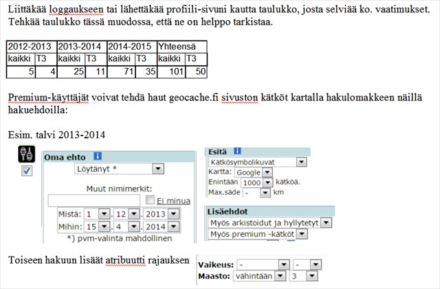 -Voidaksesi kirjata kätkön löydetyksi, sinulla pitää olla löydettynä talviaikaan (1.12 – 15.4.) 100 kätköä, jossa on lumikenkä-atribuutti.