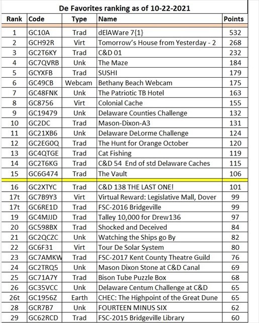 The list will be somewhat dynamic. Since 2017, Four top fav caches (including #1) were archived and a cache created in 2018 has climbed to #4 spot. As of 10-22-2921 the top Delaware favorites caches were: