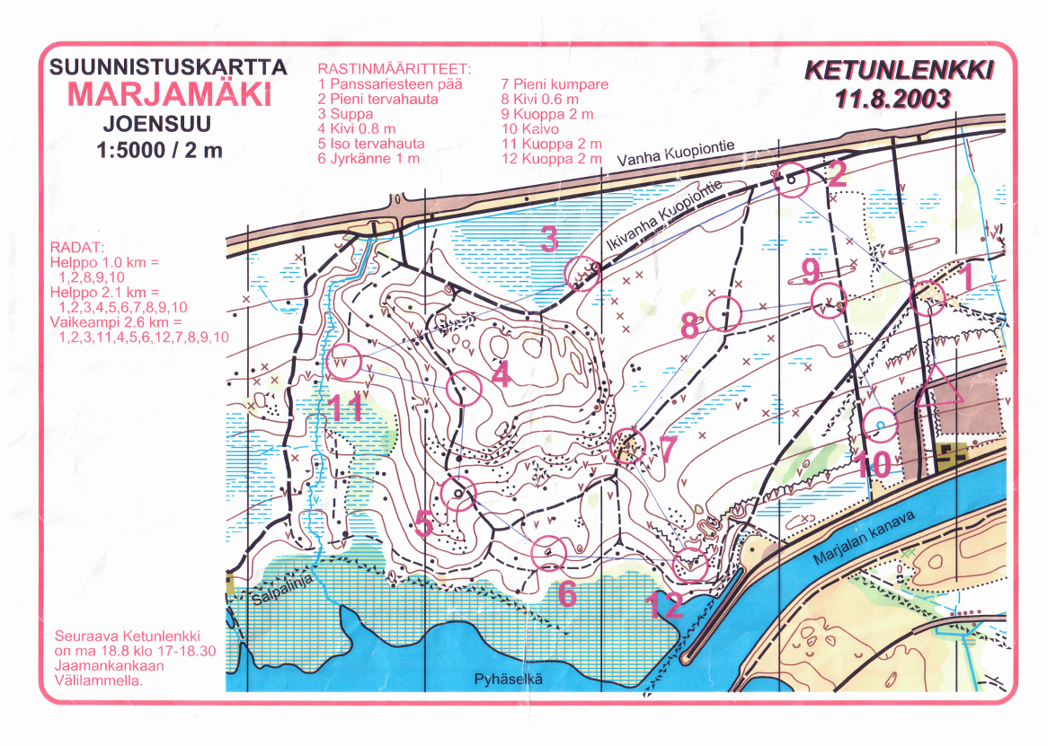 Ohessa on käyttämäni suunnistuskartta vuodelta 2003, jolloin tämä läntisen Marjalan alue oli vielä mukavakulkuista mäntymetsää. Seuraavana vuonna ei suunnistettu enää täällä vaan Kuunvirran eteläpuolella bunkkerimuseon tienoilla. Ilmeisesti uuden kaupunginosan rakentaminen oli silloin jo alkanut. On mielenkiintoista verrata vanhaa karttaa nykyiseen ja tajuta, miten paikat ovat muuttuneet tällä välin. Harmittavasti kartan metsää ei enää koskaan pääse koluamaan, koska siitä ei ole enää juuri mitään jäljellä.