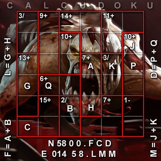 When the calcudoku has been solved, you will have numbers in the boxes with letters in them on the picture. Insert these numbers on the spots of the letters in the coordinate formula or equations, and you will get the cache coordinates.