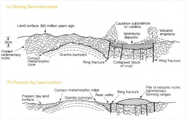 "Magma forced its way up these fractures and erupted with great violence. Eruption took place not from a single crater, but in a continuous line or arc of fire along the fractures. The magma exploded into huge billowing clouds of very hot gases carrying crystals and fragments of glass and frothed-up magma known as pumice. These turbulent mixtures flowed like boiling milk over the landscape at speeds up to 100 kilometres per hour. When they eventually came to rest, the solid particles settled into layers blanketing the surface. The resulting layer was often still hot enough for the glassy particles to stick or weld together to form a hard compact rock known as an ash flow ruff or ignimbrite." (Introducing Victorian Geology, 2nd ed. Geological Society of Australia, Melbourne: 1995).