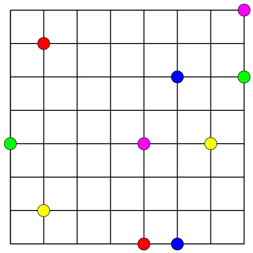 Reliez les points de même couleur en suivant les lignes du quadrillage. Les chemins ne doivent ni se croiser, ni se toucher.