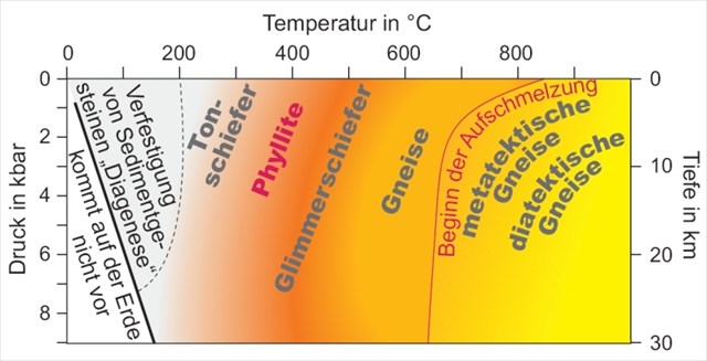 Das Druck-Temperatur-Diagramm zeigt, bei welchen Bedingungen welche Gesteine entstehen.