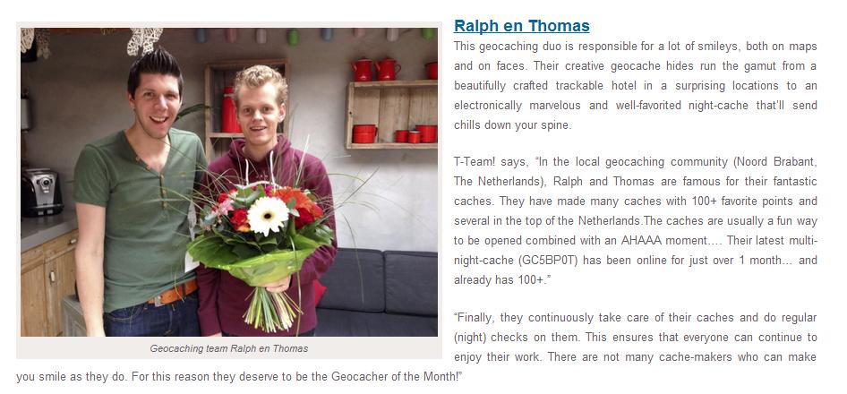 Geocaching heeft de mogelijkheid om cachers voor te dragen voor de wereldwijde "Geocacher of the Month". Voor de December Geocacher of the Month 2014, zijn Ralph en Thomas voorgedragen.