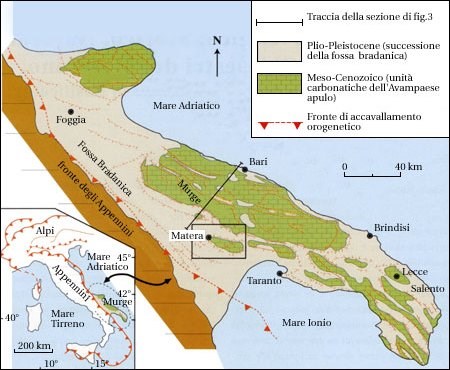 At the end of the Cretaceous and during the early part of the Cenozoic (that is, from about 65 millions of years ago), this area - with the newly formed Calcare di Altamura - surfaced from the sea.