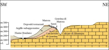 The Ravine of Matera was born about one million of years ago with the beginning of the surfacing of the area and the progressive lowering of the sea level. On the emerged surfaces streams started to cut the softer sediments of the Pliocene-Pleistocene. The current position of the river valleys can be explained with the gradual lifting of the emerged area which increased the erosive force of the water streams. Along the sides of the Ravine of Matera we can observe sequences of rocks having different thicknesses: the right side, on which stands Matera, is characterized by a greater thickness of the Calcarenite of Gravina and is less steep than the opposite side consisting only of Calcare di Altamura.