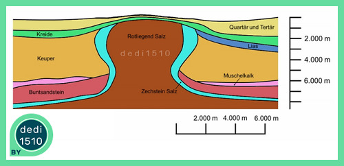Im Allgemeinen bleibt die Kreideschicht aber unter der mächtigen quartären und tertiären Schicht aus Sand, Mergel und Ton verborgen. Ein darunterliegender Salzstock sorgte aber in dieser Region dafür, dass unter der Auflast dieser und späterer Ablagerungen es an einigen Stellen zum Auftrieb der unter der Schreibkreide liegenden Salzschichten kam. Die Kreideschicht wurde dabei gleich mit nach oben aufgeschleppt, sodass man sie heute an einigen Stellen oberflächennah finden kann. Speziell in Lägerdorf beträgt die Abraumschicht über der Schreibkreide drei bis zehn Meter. Die abbauwürdige Fläche beträgt etwa zehn Quadratkilometer. Im übrigen Gebiet unseres Kreises und Landes liegt die Kreide in sehr unterschiedlicher Tiefe. Westlich von Krempe liegt sie zwischen 30 und 40 m tief, bei Büttel 350 m und bei Hamburg sogar über 800 m unter NN. Die nachfolgende Abbildung zeigt einen vereinfachten und schematischen Schnitt durch die Erdschichten in Lägerdorf.