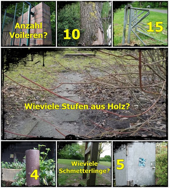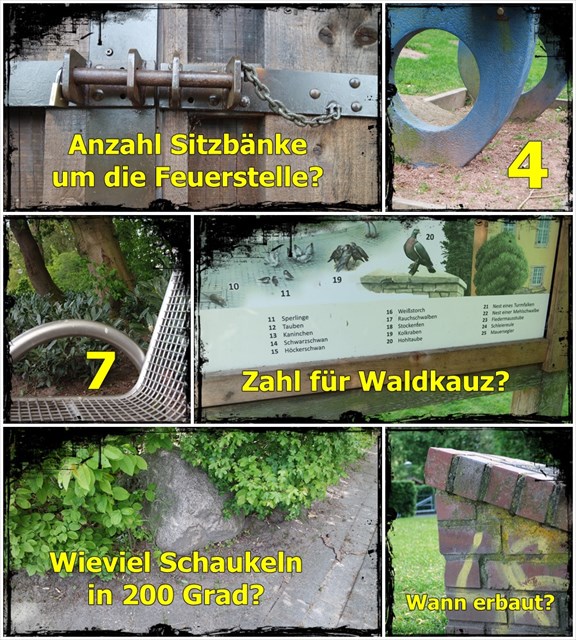 An den Stationen A-M habe ich Fotos gemacht. Findet die Objekte, die auf den Fotos zu sehen sind. Löst die Fragen nach den auf den Fotos fehlenden Informationen und ihr erhaltet Zahlen. An einigen Stationen müssen nur die Bildausschnitte gefunden werden, die Zahlen stehen auf den Fotos. Die erhaltenen Zahlen setzt man der Station gleich.