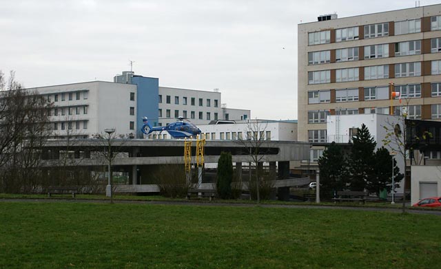 14. prosince 2015 byl slavnostně uveden do prozu nový nadzemní heliport umístění ve spodní části areálu. Stavba je situována na střeše parkovacího domu a je přímo spojena krytým tubusem s urgentním příjmem. Průměr přistávací plochy je 28,3 m. Příletové směry jsou 301°a 81°. Vrtulníky LZS tedy u starého, nyní záložního heliportu tak často neuvidíte, přesto je dále používán pro určité druhy pacientů.