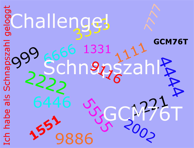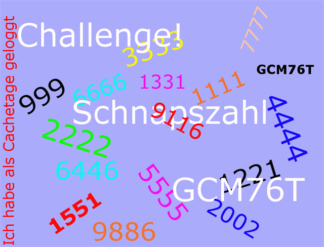 Bitte gebt auch an welchen Type Ihr genutzt habt um diese Challenge zu loggen ( GC-Code , Schnapszahl, Palindrom, Ambigramm, Cachetage )