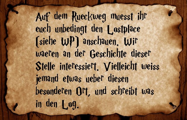 Falls Du diese Cacheidee nicht weiterverfolgen möchtest, denke bitte daran eventuellen Geomüll (Cachebehälter, Zwischenstationen) wieder einzusammeln. Solltest Du nochmals Interesse an einem Cache hier haben, so musst Du nun leider ein neues Listing dazu anlegen.