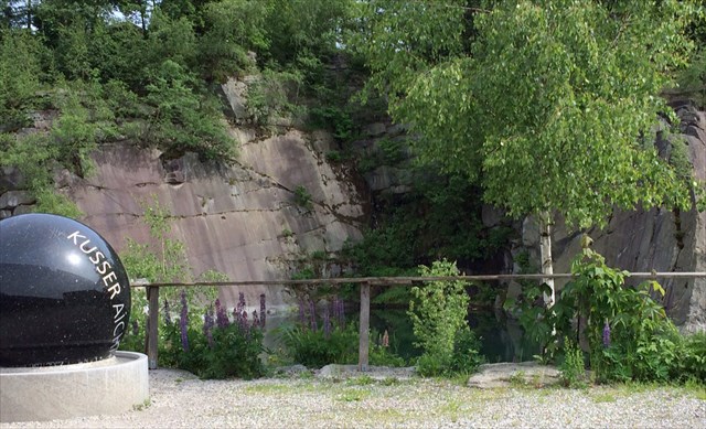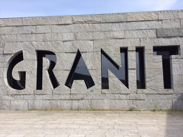 4. Begebt euch nun zu den Koordinaten von S1. Ihr steht vor dem Eingang des Granitzentrums. Rechts von euch ist eine polierte Granitwand, links davon eine rohe Granitwand – beschreibe wie sich das Polieren auf das Aussehen des Granits auswirkt.