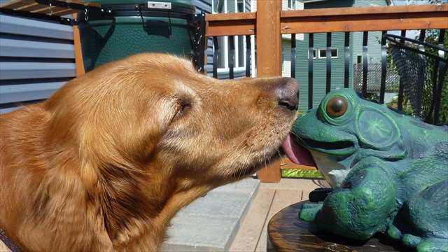 Golden Pooch kissing a frog... Maybe that will turn into a smiley..