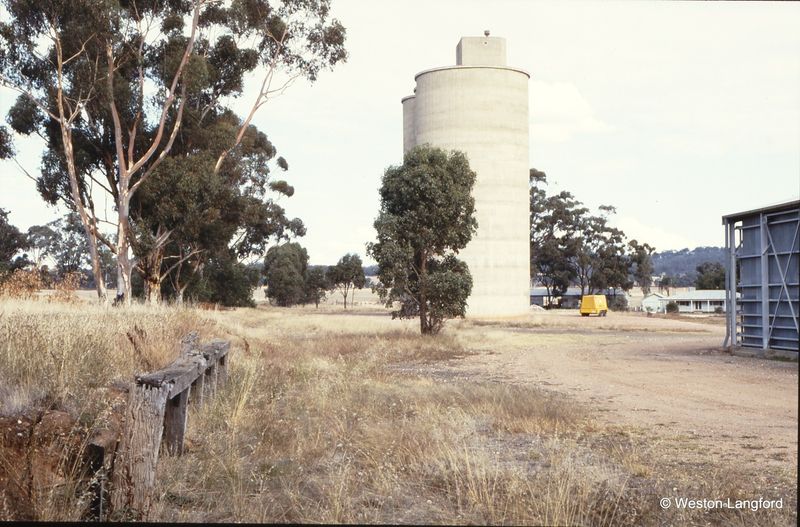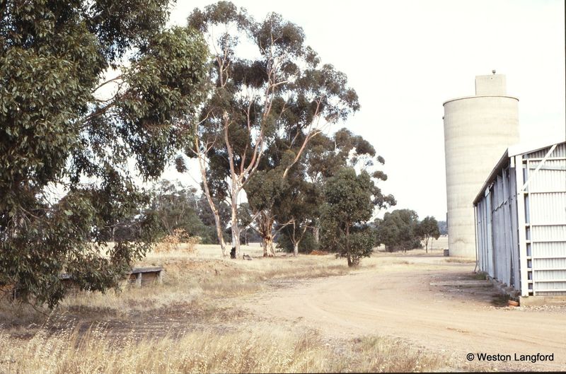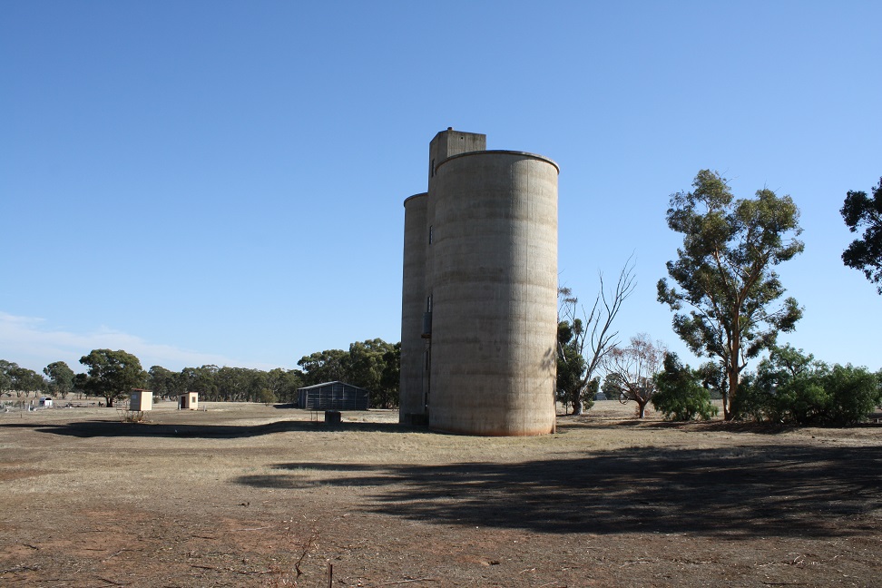I spoke with a local who knew a lot about the area, whilst placing the cache. Apparently the station site is owned by the Wheat Board but the silos can't be used due to OH&S. They also can't be demolished due to their construction and the proximity of the nearby houses, so they've been left as is. Since the closure of the silos, the farmers have to take the grain to Dunolly.