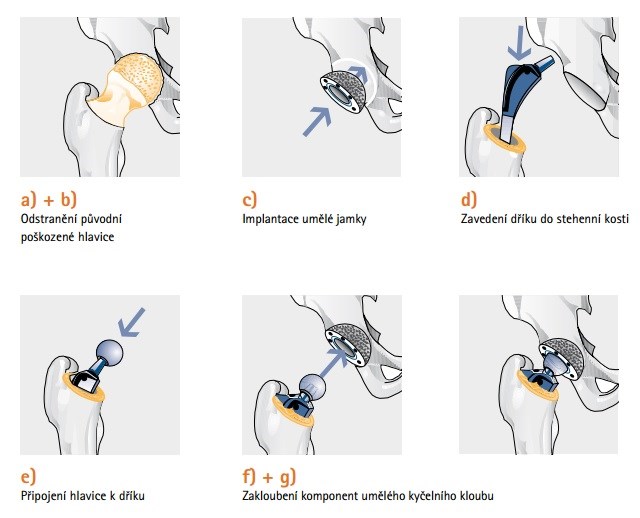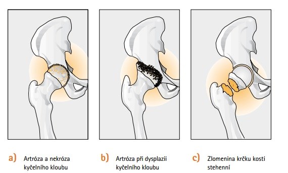 1. Artróza – destrukce kloubní chrupavky – je zdaleka nejčastějším důvodem implantace nového kyčelního kloubu. Jedná se o velmi pozvolný, plíživý proces, kdy prostřednictvím tisíců pohybových cyklů v průběhu života dochází k postupnému zničení kloubní chrupavky. V konečném důsledku dochází ke přímému kontaktu kosti jamky s kostí hlavice, doprovázenému bolestmi při chůzi a dokonce i v klidu. Nekróza hlavice kosti stehenní naproti tomu souvisí s metabolickými změnami. Následkem poruchy cévního zásobení nastává rozpad kosti hlavice stehenní kosti. Počátek tohoto stavu může spočívat v postižení kyčelního kloubu, ke kterému došlo v minulosti.