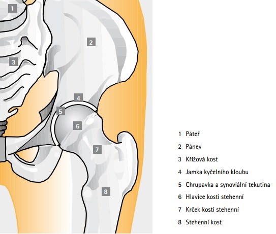 Kyčelní klouby spojují horní část těla s pohybovým aparátem dolní části těla a významně se podílí na schopnosti pohybu člověka. Skládá se z kloubní jamky, uložené v pánevní kosti, a z hlavice stehenní kosti. Svaly otáčejí hlavici stehenní kosti v jamce kyčelního kloubu různými směry a umožňují tak pohyb. Vzhledem k mnoha možným směrům pohybu je kyčelní kloub řazen ke kloubům kulovým. Hlavice stehenní kosti i jamka jsou u zdravého člověka opatřeny vrstvou chrupavky. Hladký povrch chrupavky a kloubní (synoviální) tekutina, sloužící jako lubrikant, umožňují plynulý pohyb v kloubu.
