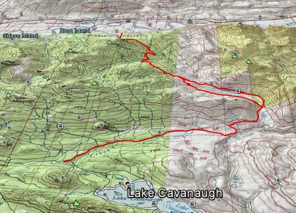 The Lake Cavanaugh route starts at a logging road going uphill from Lake Cavanaugh road. Park across the road and do not block the gate or drive through when it is open. This gate may be locked at any time.