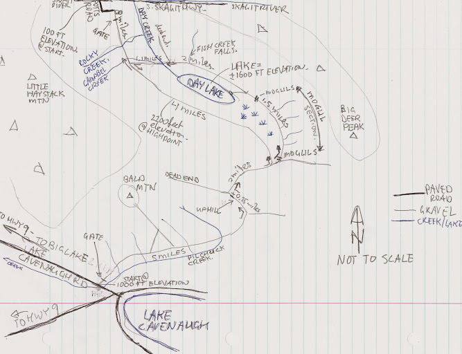 Day lake is a large lake in Skagit County. Not many people have been here. There are several ways in. Two routes are described here. The easiest route starts at Lake Cavanaugh road at about 1000 feet elevation. (10 miles one way) near DL1. The loop around Day lake from Lake Cavanaugh is about 24 miles with 2200 feet as the highest point. From Lake Cavanaugh road to Potts road along the south Skagit highway is about 21-22 miles. There is a gate south of Potts road as well.