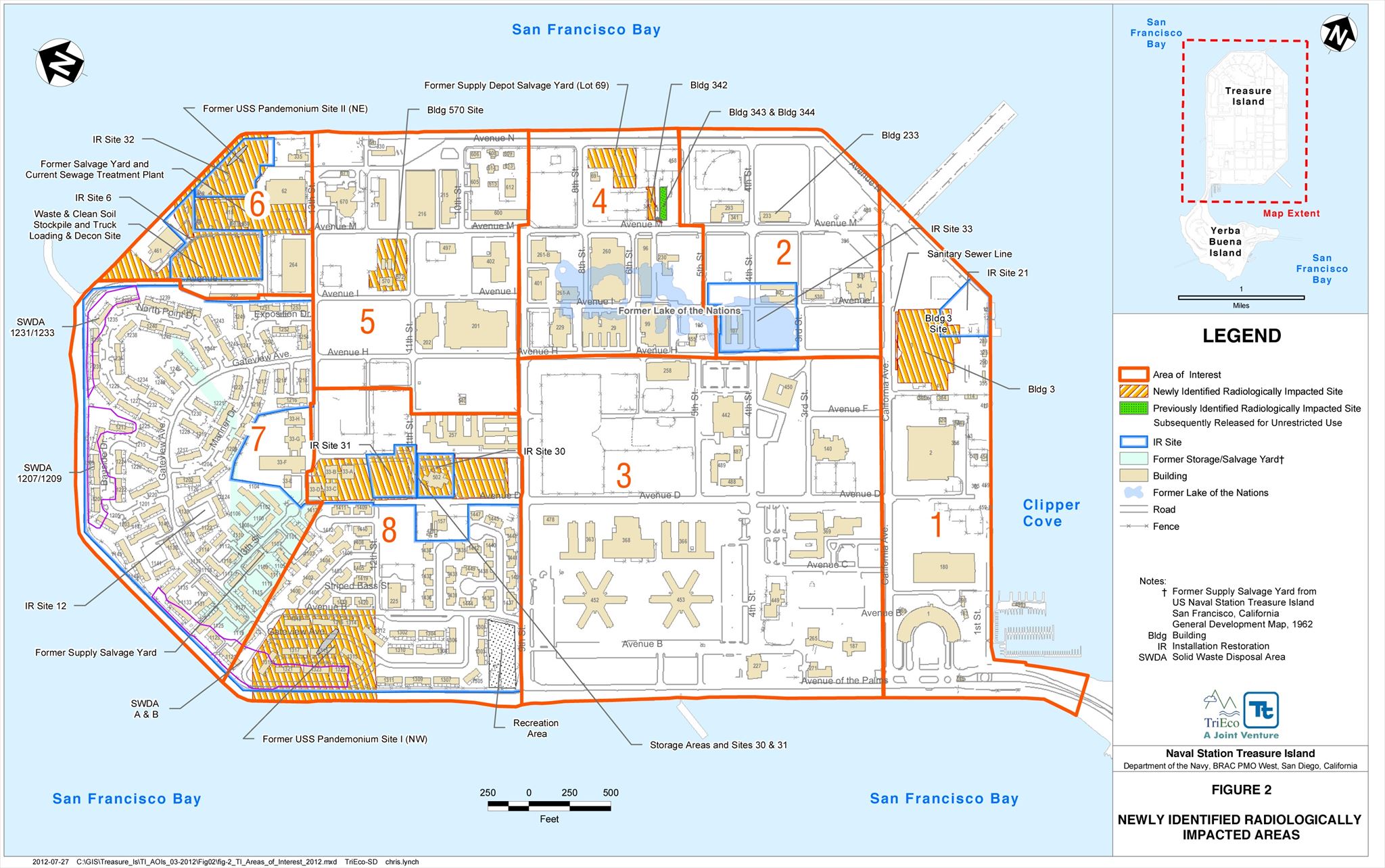There are 6 radiologically impacted sites on Treasure island, with varying degrees of severity. Cleanup is still ongoing at several of the sites, however it must be stated that the levels of ionizing radiation that are currently present are very low, even around the sites that are fenced off and designated as radiologically controlled areas.