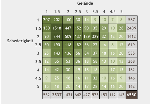 Für die vorliegende Challenge musst du mindendestens 100 Caches je Geländelschwierigkeit 1,0 - 3,5 gefunden haben.