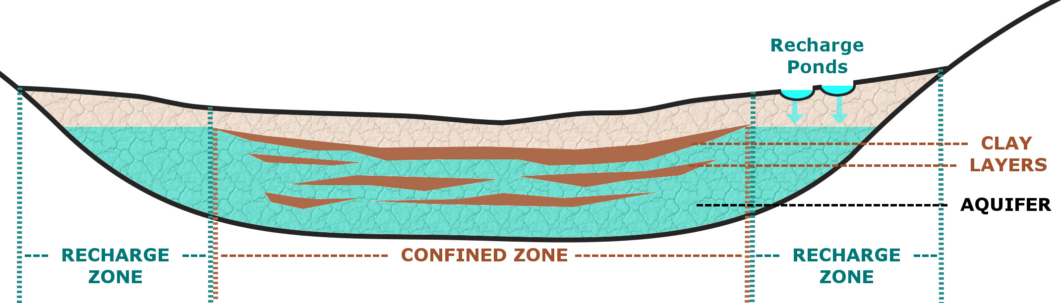 In the middle of the subbasin, a continuous clay layer prevents surface water from seeping into the aquifer layers below. Groundwater recharge cannot occur in this confined zone, which is several miles across. Around the edge of the basin, there is no continuous clay layer. In this unconfined recharge zone, surface water can seep (percolate) through the earth's layers into the aquifer, recharging the groundwater.
