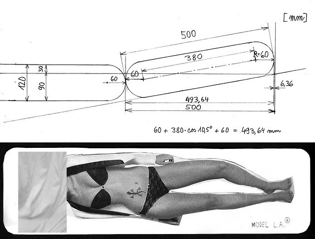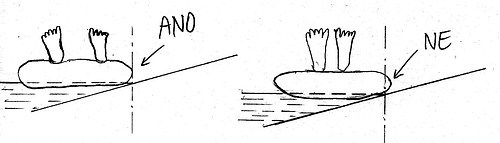 V minulé verzi byla zdrojem poněkud emotivní diskuse otázka, zda ta krajní řada ještě splňuje podmínky zadání nebo už ne (viz obr.: Krajní lehátko totiž bude ležet na dně šikmo a opravdu přesáhne dolní hranou o 1 – 2 cm povolenou hranici). Zadání jsem totiž velice zjednodušil, aby se to vůbec nějak dalo počítat. Ve skutečnosti by byl ponor lehátek větší než na tomto obrázku a ta v krajní řadě rovnoběžná s břehem budou skoro celá ležet šikmo na dně, jak vidíte na horním obrázku (jsou totiž zatížená). Je zřejmé, že ani pak okraj lehátka mnou navrženého tvaru stanovenou hranici nepřesáhne, dokonce je tam ještě víc než šestimilimetrová rezerva. Podobná situace bude i u lehátek umístěných delší osou kolmo na břeh. Takže ta lehátka klidně pokládejte i do mezery široké 50 nebo 180 cm a nekomplikujte si život. Vždyť je to jenom hra...
