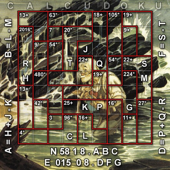 When the calcudoku has been solved, you will have numbers in the boxes with letters in them on the picture. Insert these numbers on the spots of the letters in the coordinate formula or equations, and you will get the cache coordinates.