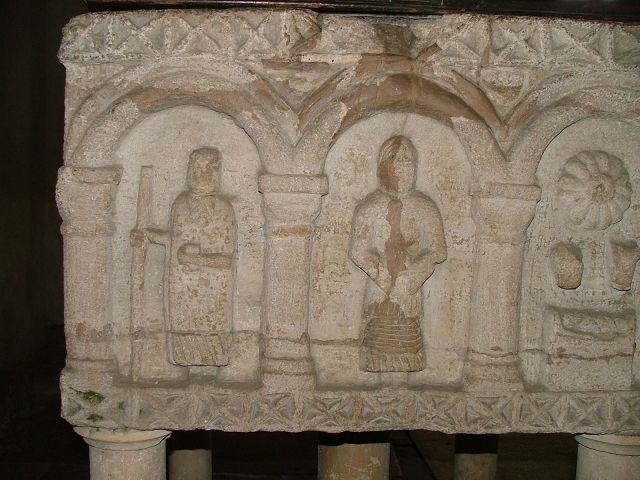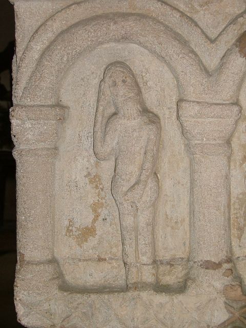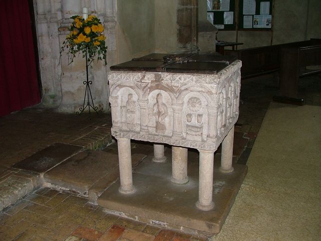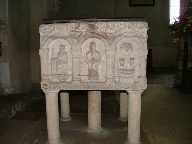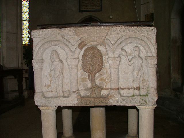 This is the famous Fincham font, one of the best Norman fonts in East Anglia. It probably came from the lost neighbouring church of Fincham St Michael, and sits foursquare on a little raised platform. Each side has three panels, making twelve in all, and each side depicts a scene from the Bible. On the south side is the nativity; Joseph and Mary inhabit the first two panels, while the third depicts the infant Christ in the manger. Two oxen low above him, facing out of the panel, and above is a magnificent star. This will guide the three Magi on the eastern panels. The north panels depict Adam and Eve in the Garden of Eden, with the tree of Knowledge between them restored by the Victorians. Adam hides his nakedness, and holds his head in despair. In contrast, the western panels depict a magnificent Baptism of Christ, with John the Baptist on the right and a Bishop on the left. In the centre, a dove descends onto Christ who appears to be standing in a font. You can see all these images below.