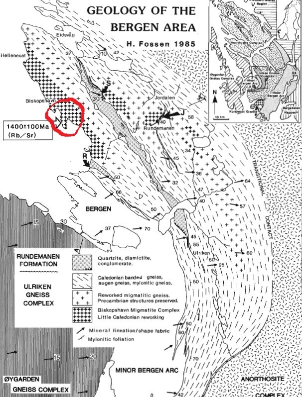 Haakan Fossen (1988) The Ulriken Gneiss Complex and the Rundemanen Formation: a basement-cover relationship in the Bergen Arc, West Norway. Nor. Geol.unders. Bull. 412 67-86.