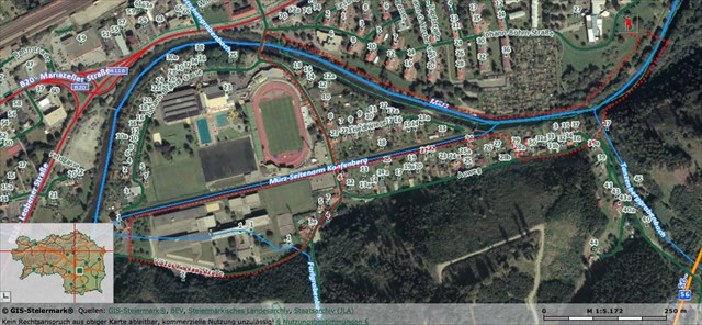 Treffpunkt ist der Spielplatz vis a vis vom Sozialhilfeverband Johann Böhmstraße. Die Route verläuft entlang der Mürz Richtung Wehranlage, Planetenweg, HTBL, Stadion und andererseits der Mürz wieder Retoure, anbei die Karte (Rot gepunktete).