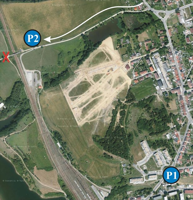Varianta druhá. Geovozidlo můžete nechat na panelové cestě, která vede z Čekanic do slepé ulice k mostku přes trať (viz.parking P2). Blíž už se (ovšem teoreticky) nedostanete, jsou tam pak zákazy vjezdu. Na tuto panelku se dostanete pouze z Čekanic, nejezděte sem od toho velkého mostu přes Jordán (značky to zakazují a může tam jít tzv. "o hubu"). Ke keši pak vede vede široká cesta podél kolejí (nevím, nejde-li o pozemek dráhy) a nebo úzká pěšinka ve svahu nad nimi.
