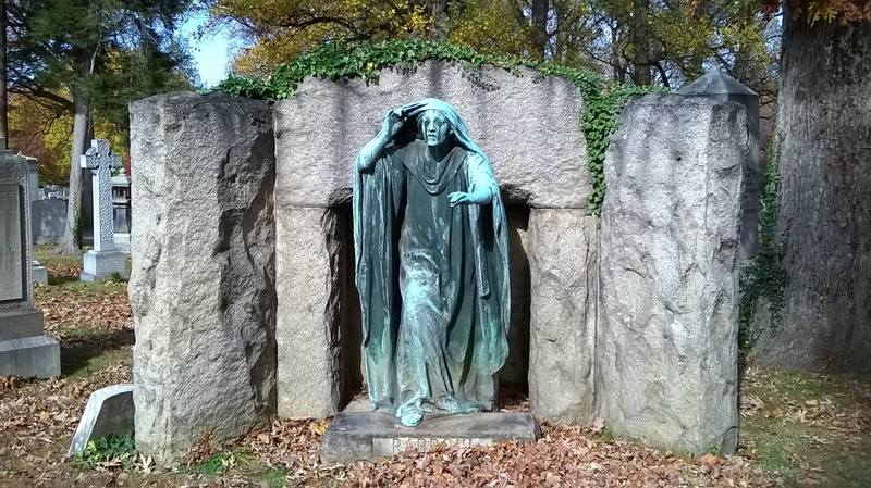 This monument, designed by Saint-Gaudens, was erected in 1891. It was commissioned by Henry Adams as a memorial to his wife, Marian "Clover" Hooper Adams, who had committed suicide through the ingestion of potassium cyanide. Adams asked Saint-Gaudens to cast a memorial representing the Buddhist idea of nirvana where there is no joy or sorrow. Adams, who traveled to Japan to find inspiration for this memorial, particularly wanted elements of serenely immovable Buddhist human figures to be contrasted with the waterfall-like robe associated with Kannon, an iconic image from Buddhist devotional art. In addition to the still and flowing elements, the monument's dualism includes male-female fusion in the figure itself and blends Asian and European ideals of figure. These checks to the standard heroic figure combine to make a "countermonument" for a woman who disliked monuments generally. On March 16, 1972, the Adams Memorial was listed on the National Register of Historic Places.