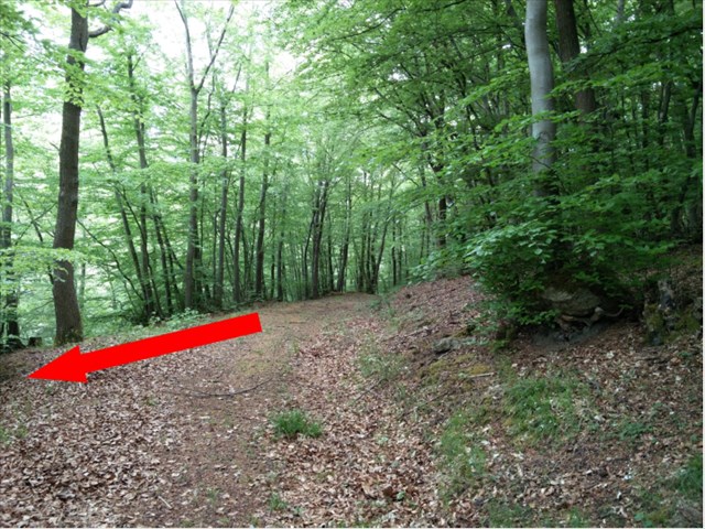Schnell renne ich zurück und auf den bei den Steinen beginnenden oberen Weg geht's in nordwestlicher Richtung auf diesem weiter. Nach ca. 150m biege ich an diesem Stein links runter in den alten Weg ab.